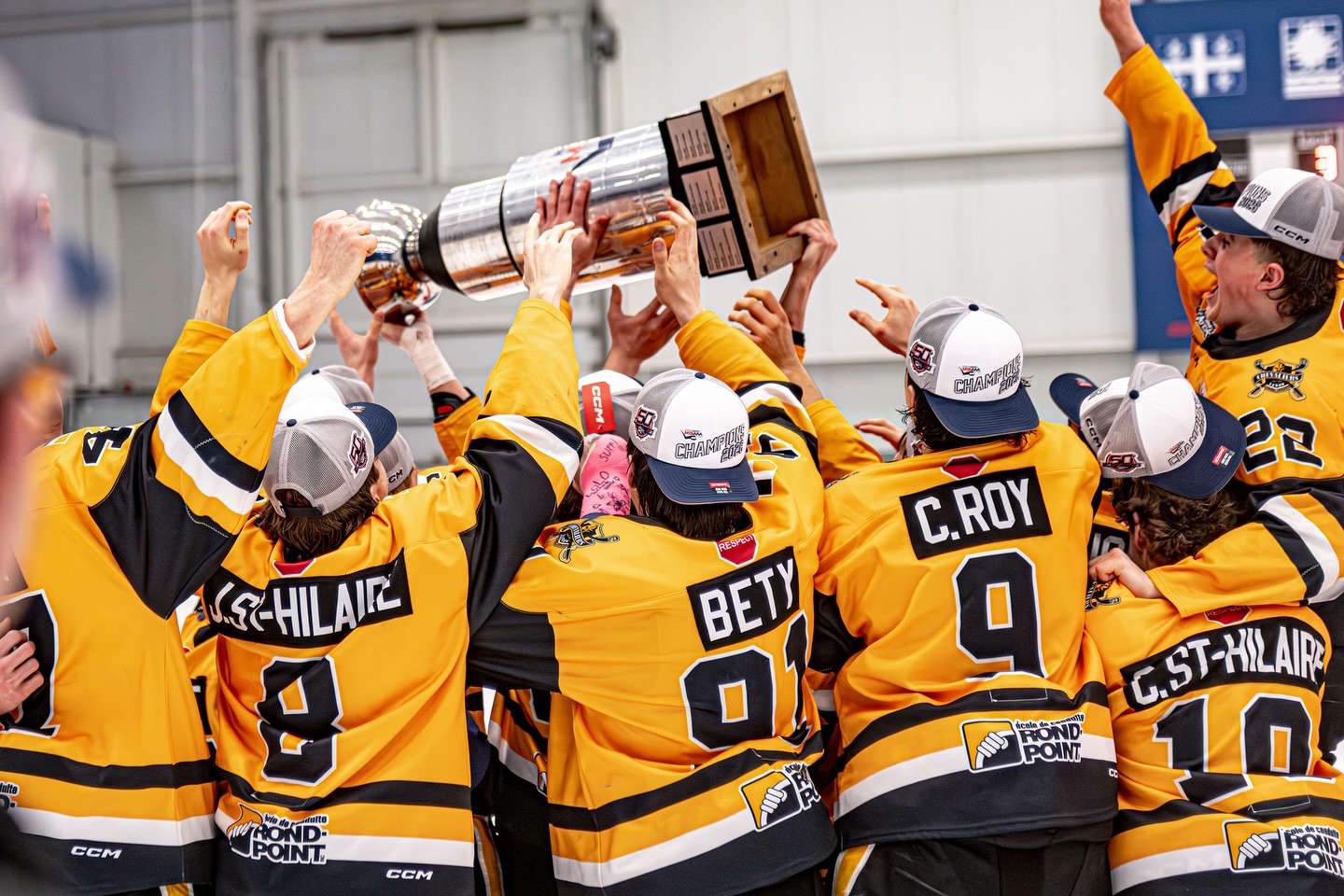 The Lévis Chevaliers hoist the Jimmy-Ferrari Cup after winning the league title in five games over the Blizzard from the Séminaire Saint-François. The Chevaliers will be the Quebec representatives in the upcoming Telus Cup. (Photo courtesy of Ligue de développement du hockey U18 AAA)