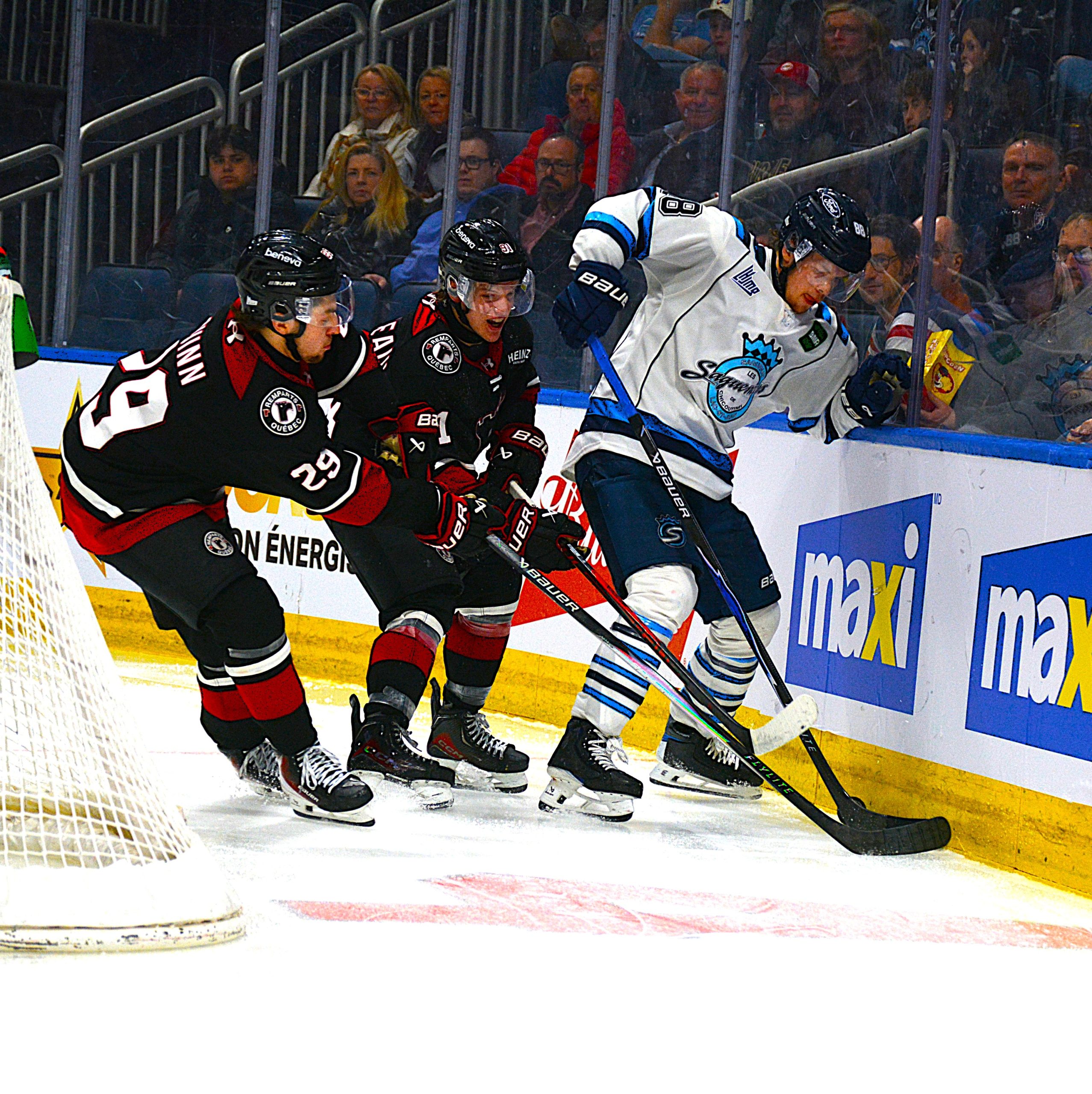 Nathan Quinn (29) and Alex Desruisseaux of the Remparts try to get the puck from Chicoutimi forward Anton Linde in game four of the second round of the QMJHL playoffs, at the Videotron Centre on April 15. Chicoutimi defeated the Remparts 5-0. (Photo by Luc Lang)