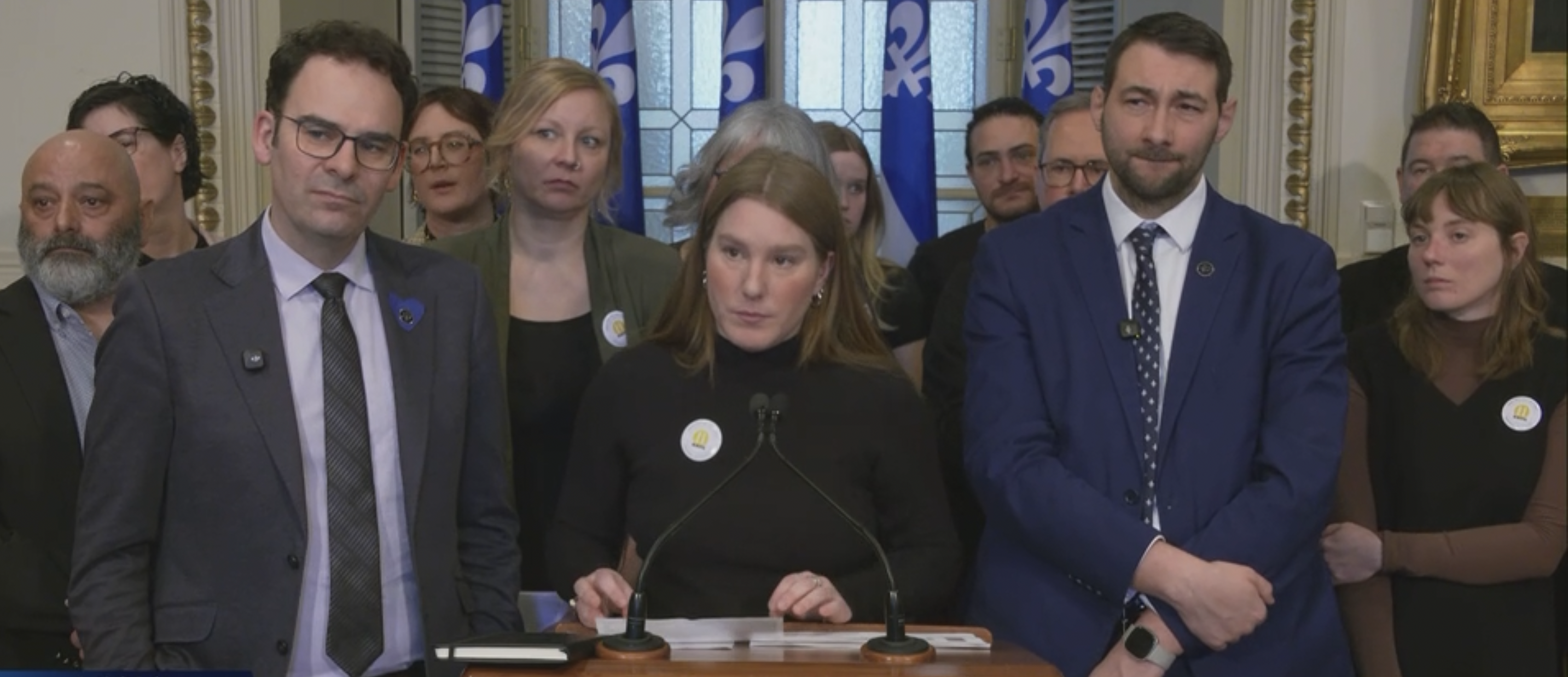 Mary-Lee Plante, co-ordinator of the Réseau d’aide aux itinérants et itinérantes de Québec, speaks at a National Assembly press conference on Feb. 26, flanked by Taschereau MNA Étienne Grandmont and Québec Solidaire social services critic Guillaume Cliche-Rivard and surrounded by directors of homeless shelters and homelessness prevention programs around the city. (Screenshot via National Assembly website)