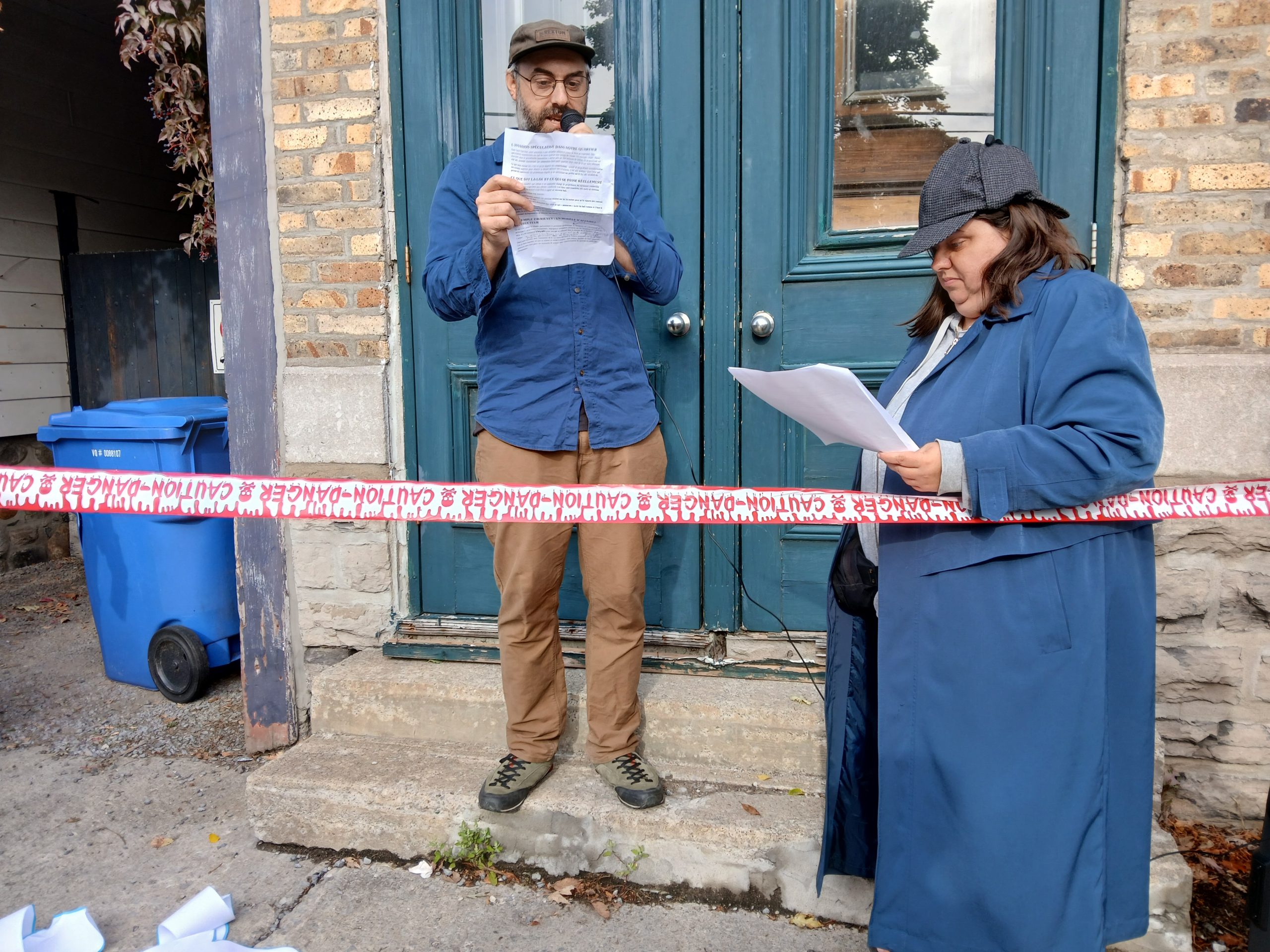 Charles-Olivier P. Carrier of the Comité Logement d’aide de Québec Ouest (CLAQO) and Marie-Ève Duchesne of the Comité populaire Saint-Jean-Baptiste (in character as “Hercule Condo” and “Agatha Taudis”) led a “crime scene tour” highlighting the difficulties low-income renters face in the current housing market. (Photo by Ruby Pratka)