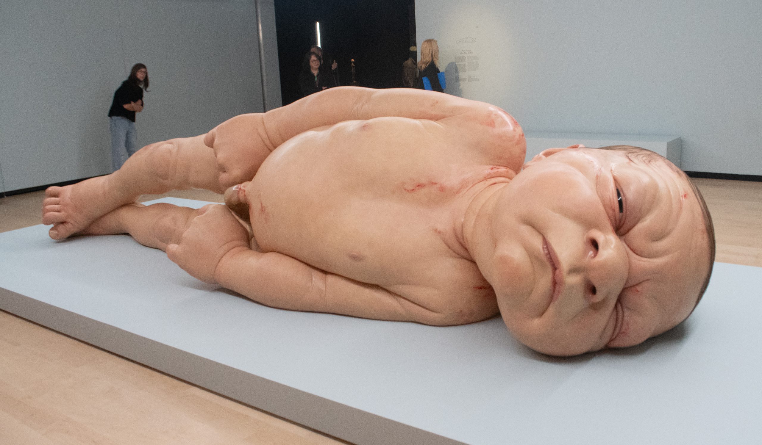 The giant newborn baby My Girl by Ron Mueck catches the attention of visitors. (Photo by Cassandra Kerwin)