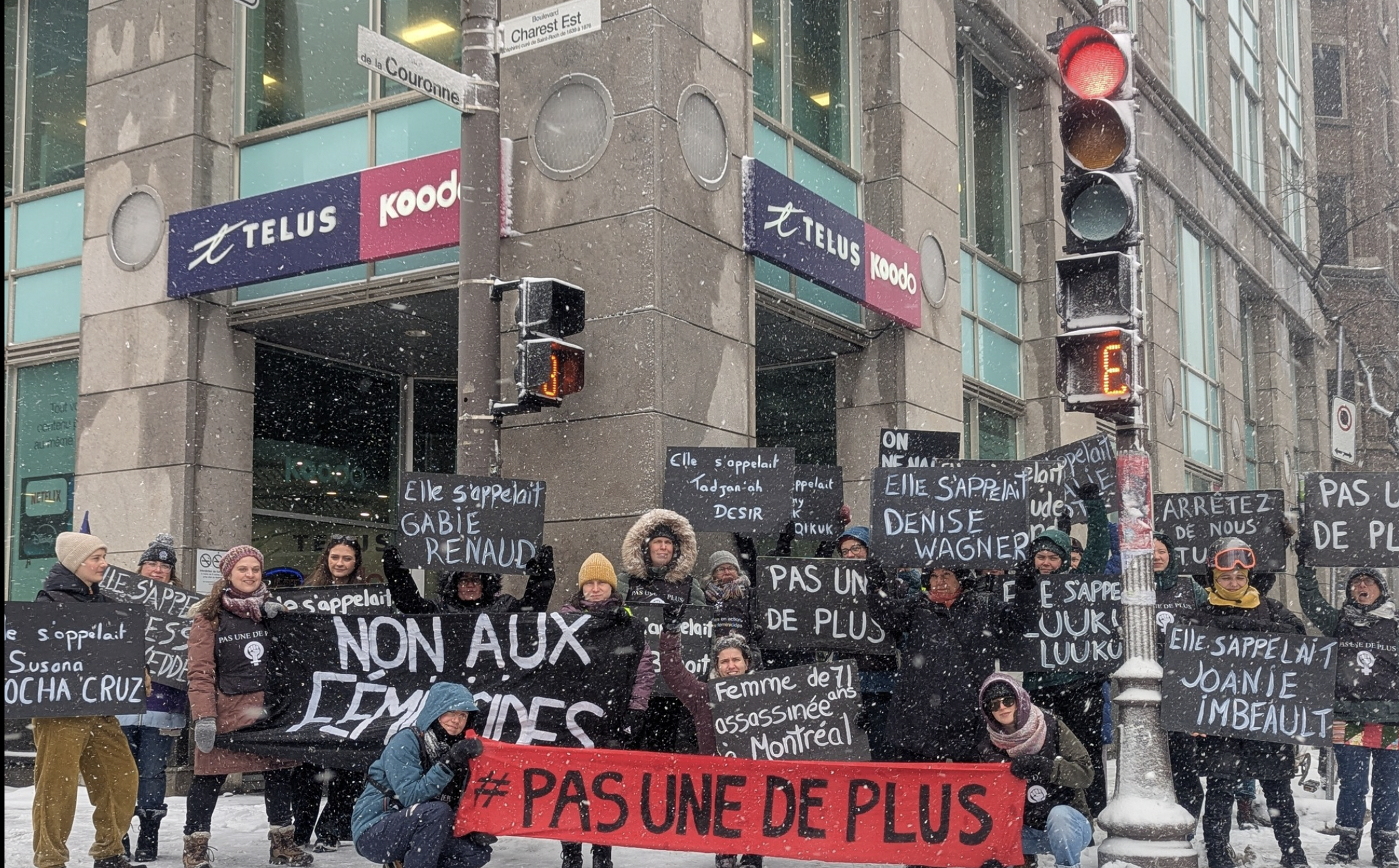Members of the Régroupement des groupes de femmes de la Capitale-Nationale hold signs with the names of domestic violence victims during a January protest in Saint-Roch. The red sign in the foreground reads “Not one more.” (Photo courtesy of the Regroupement des groupes de femmes de la Capitale-Nationale)