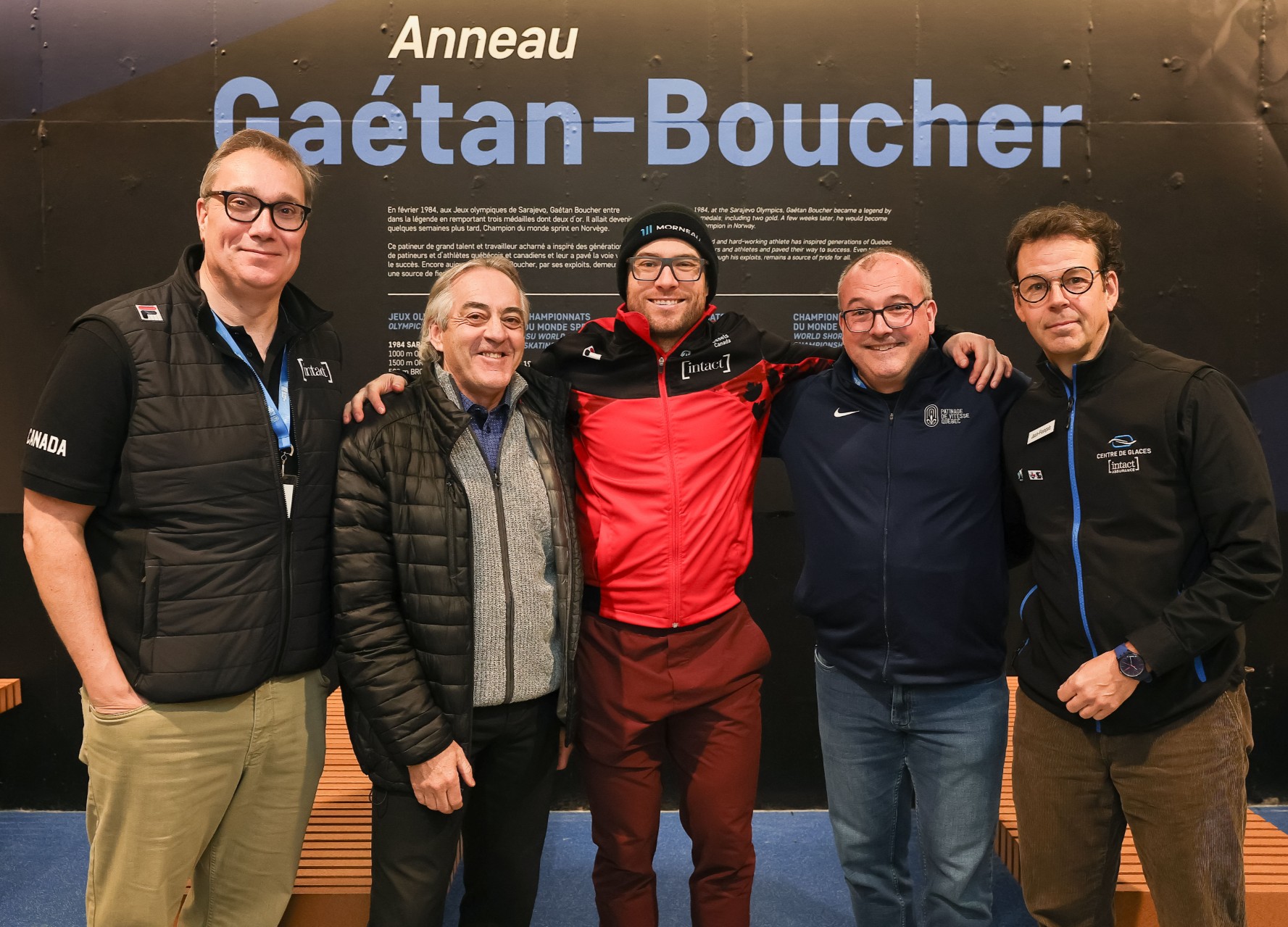 Joe Morissette (CEO of Speed Skating Canada), Gaétan Boucher, Laurent Dubreuil, Robert Dubreuil (executive director of Patinage de vitesse Quebec) and Jean-François Harvey (director general of the Centre de glaces Intact Assurance) celebrate Laurent Dubreuil’s track record for the 500-metre race at the Centre de glaces on Jan. 5. (Photo courtesy of Bartlema Action Photography/Tjerk Bartlema)