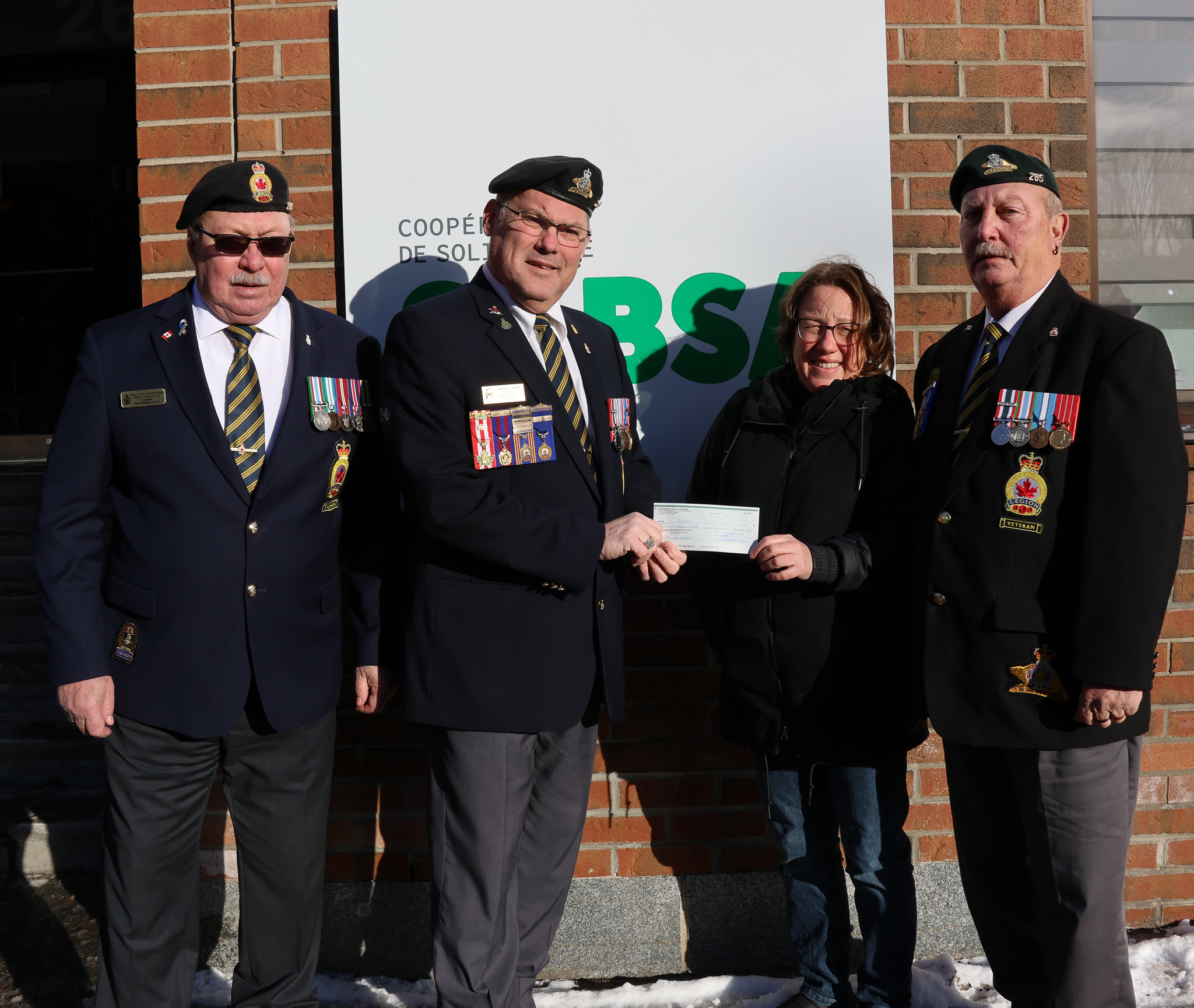 Poppy Campaign committee treasurer Denis Robitaille, Branch 265 president André Lavallée and Poppy Campaign committee director Gérard Trudeau (far right) present a cheque to Isabelle Têtu, IPSLP nurse practitioner, Fondation SABSA, on Dec. 22. (Photo by Luc Viau courtesy of Branch 265)