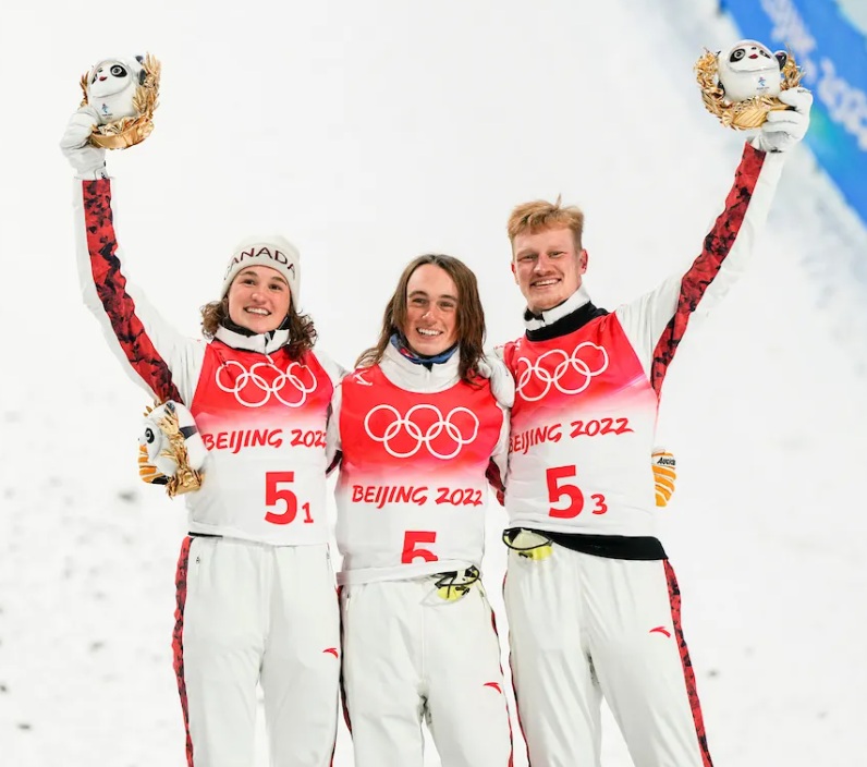 Marion Thénault, Miha Fontaine and Lewis Irving waved to the crowd after winning the bronze medal in the mixed team aerials event at the 2022 Beijing Winter Olympics. The trio is back to compete at the Milan Cortina Olympics in February. (Photo courtesy of COC/Kevin Light)