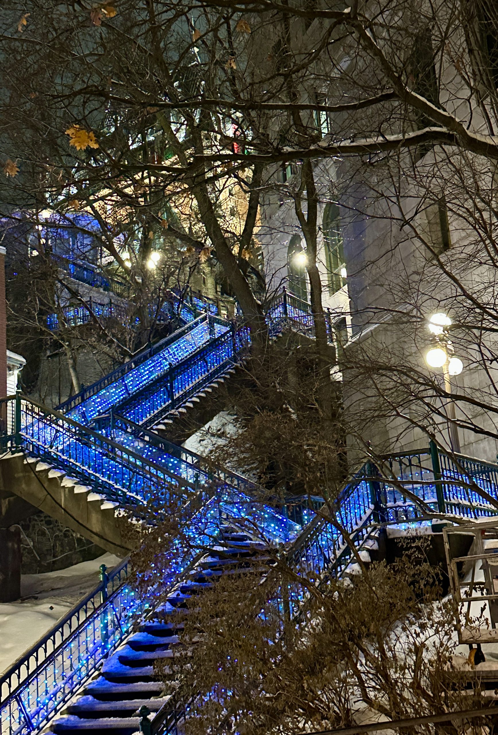 The 95 wooden steps of the Escalier Frontenac are illuminated for Québec s’illumine! linking Lower and Upper Town between Côte de la Montagne and the Château Frontenac. (Photo by Danielle Burns)