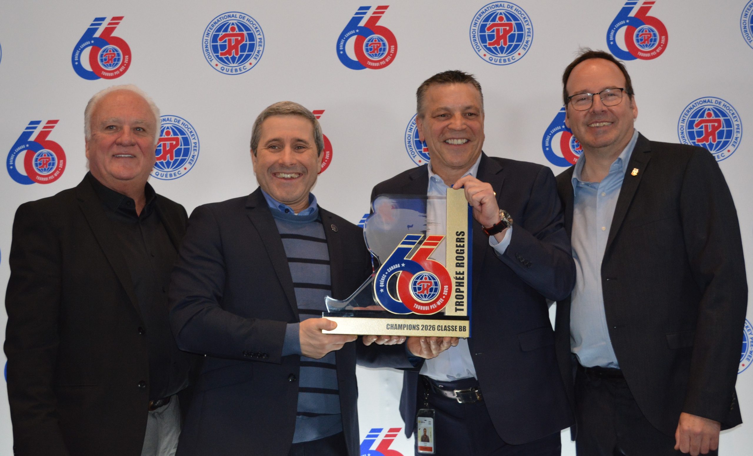 Michel Plante, president of the 66th Quebec International Pee-Wee Hockey Tournament; minister responsible for the Capitale-Nationale region Jean-François Simard; tournament general manager Patrick Dom; and city councillor Éric Courtemanche Baril, member of the executive committee responsible for sports and recreation, attended the pre-tournament press conference on Jan. 13. (Photo by Luc Lang)