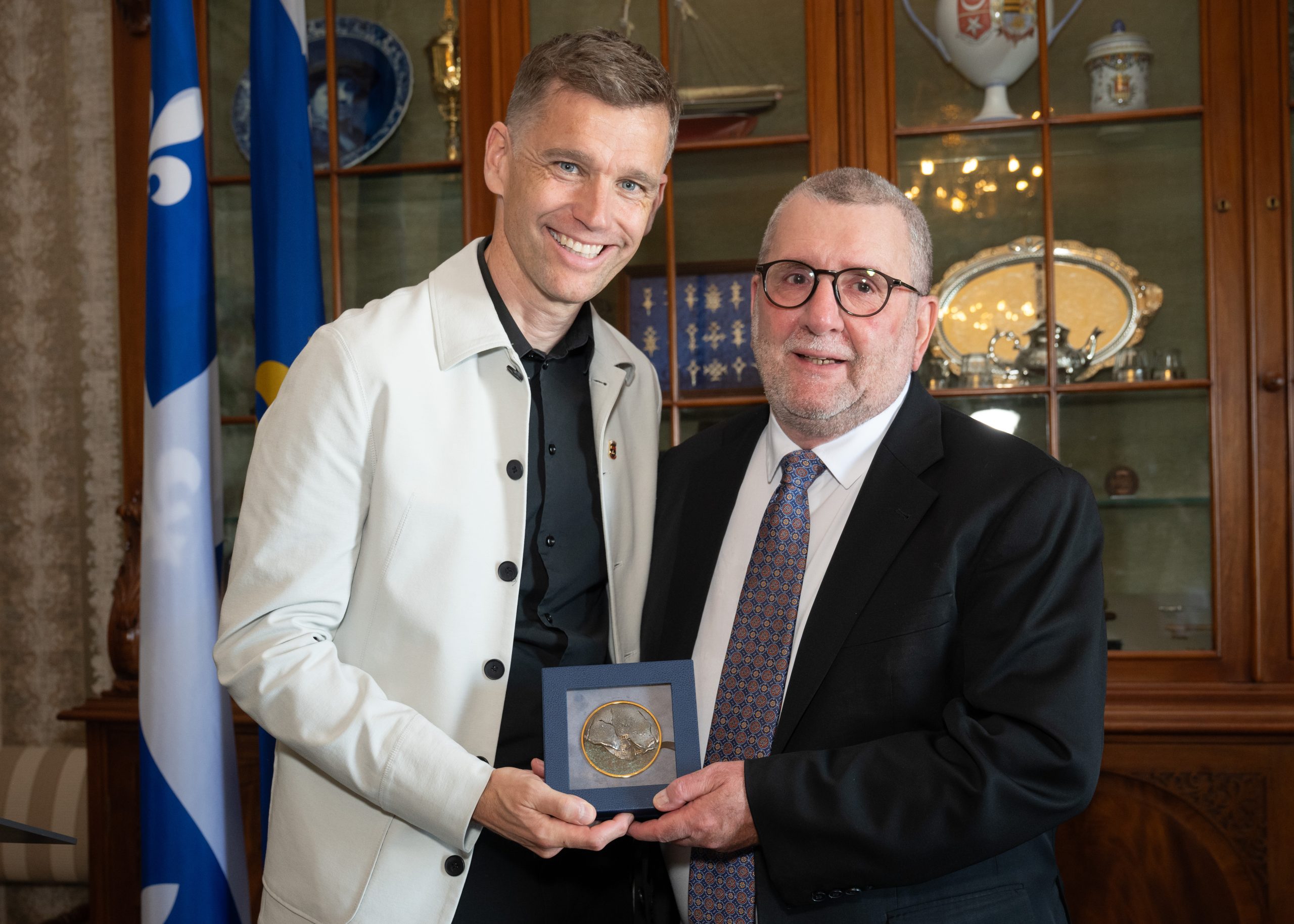 Mayor Bruno Marchand presents the Ville de Québec’s first Outstanding Contribution Award to his predecessor Régis Labeaume, mayor from 2007 to 2021. (Photo courtesy of the Ville de Québec)