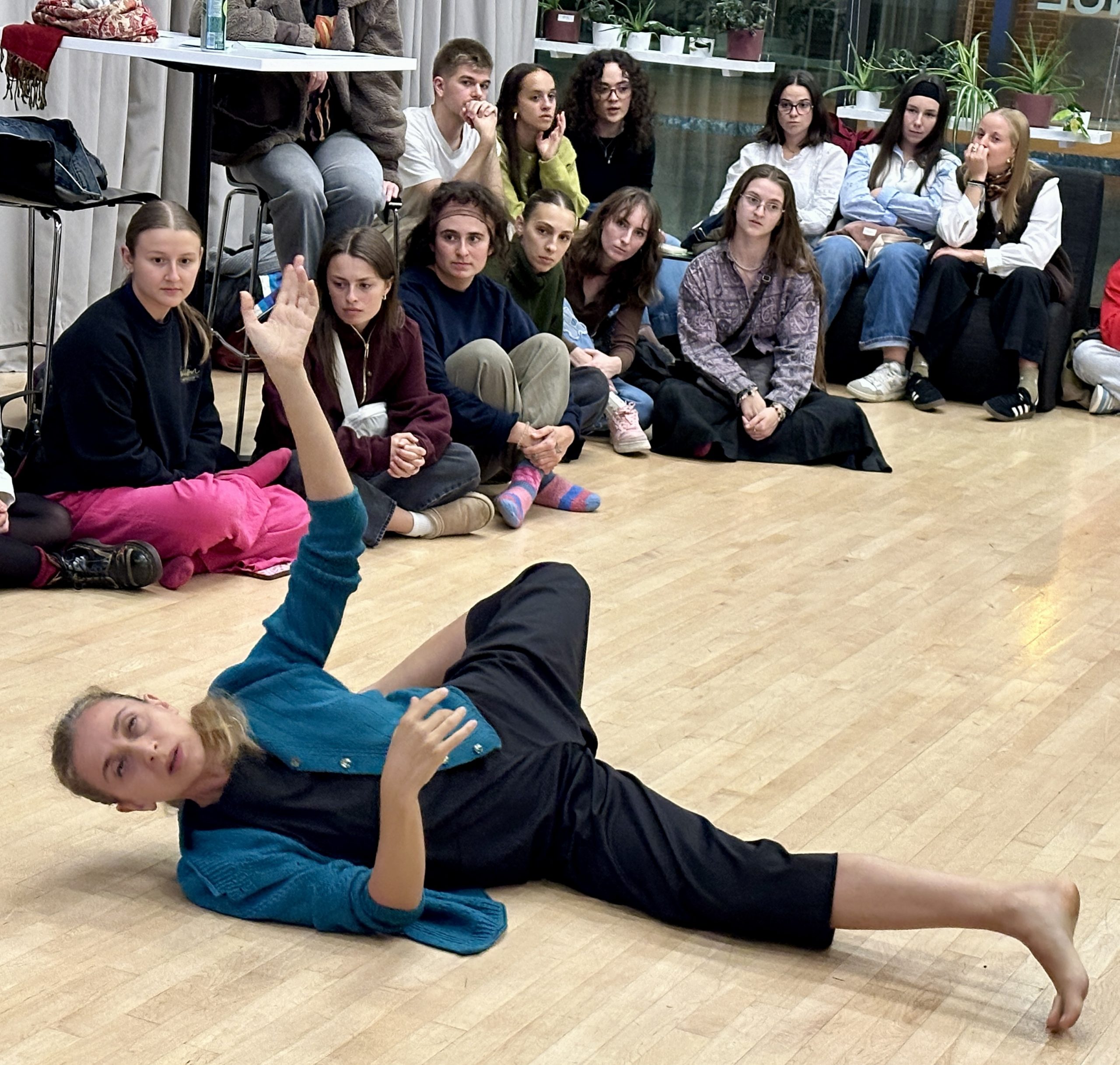 Ambra Senatore began the theatrical performance in the front room of the Maison de la Danse before leading the audience to the theatre. (Photo by Danielle Burns)