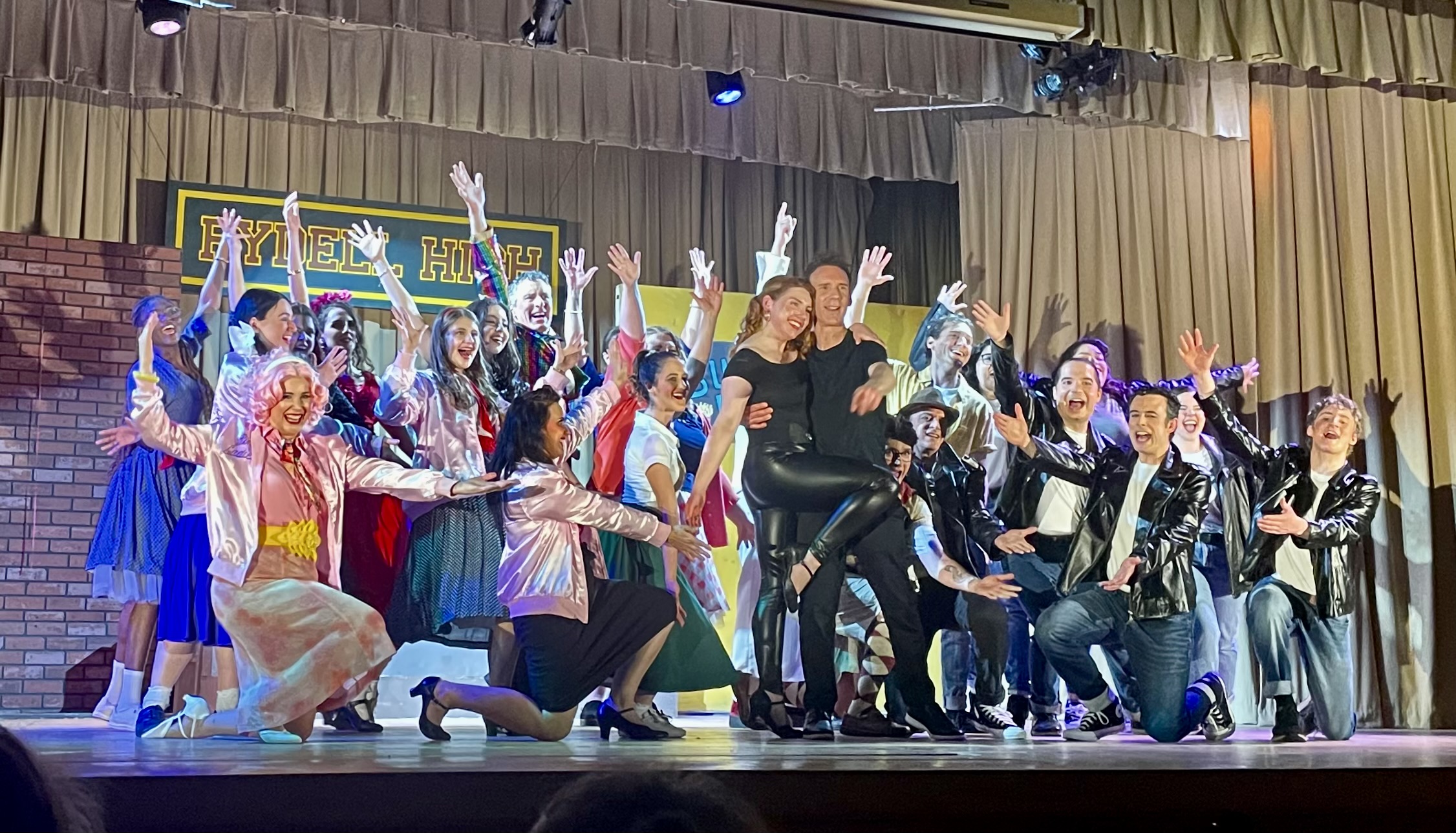 The cast of Grease, with Sandy (Jacqui Johnson) and Danny (René Arsenault) at centre stage, bring the house down with their grand finale, singing “Grease is the time, is the place, is the motion!” (Photo by Shirley Nadeau)