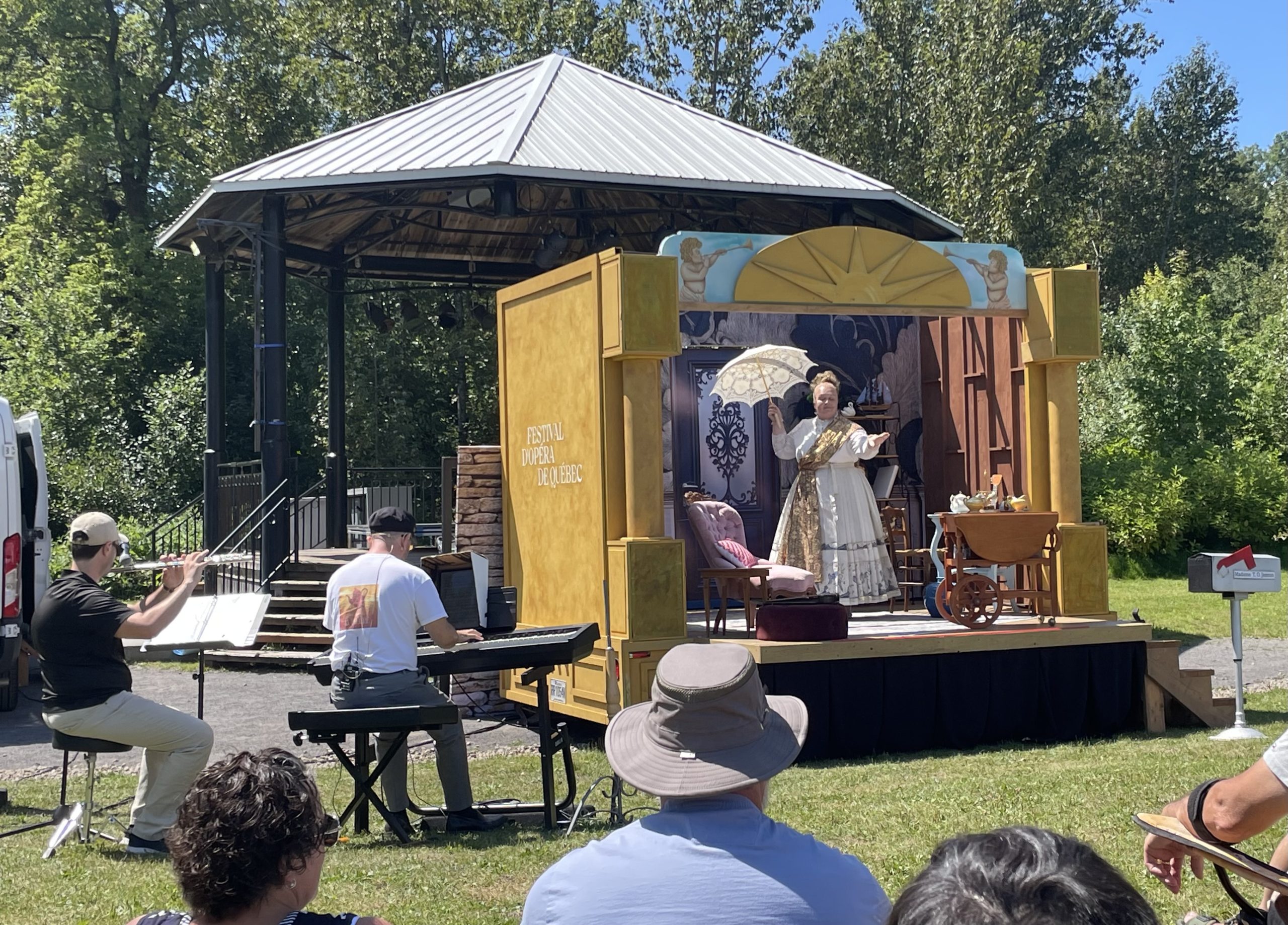 Flutist Jean-Philippe Lavoie and pianist Jean-François Mailloux, co-creators of the mini-opera Madame Théière, accompany Priscilla-Ann Tremblay as she performs from the roving theatre in the park by Maison O’Neill. (Photo by Shirley Nadeau)