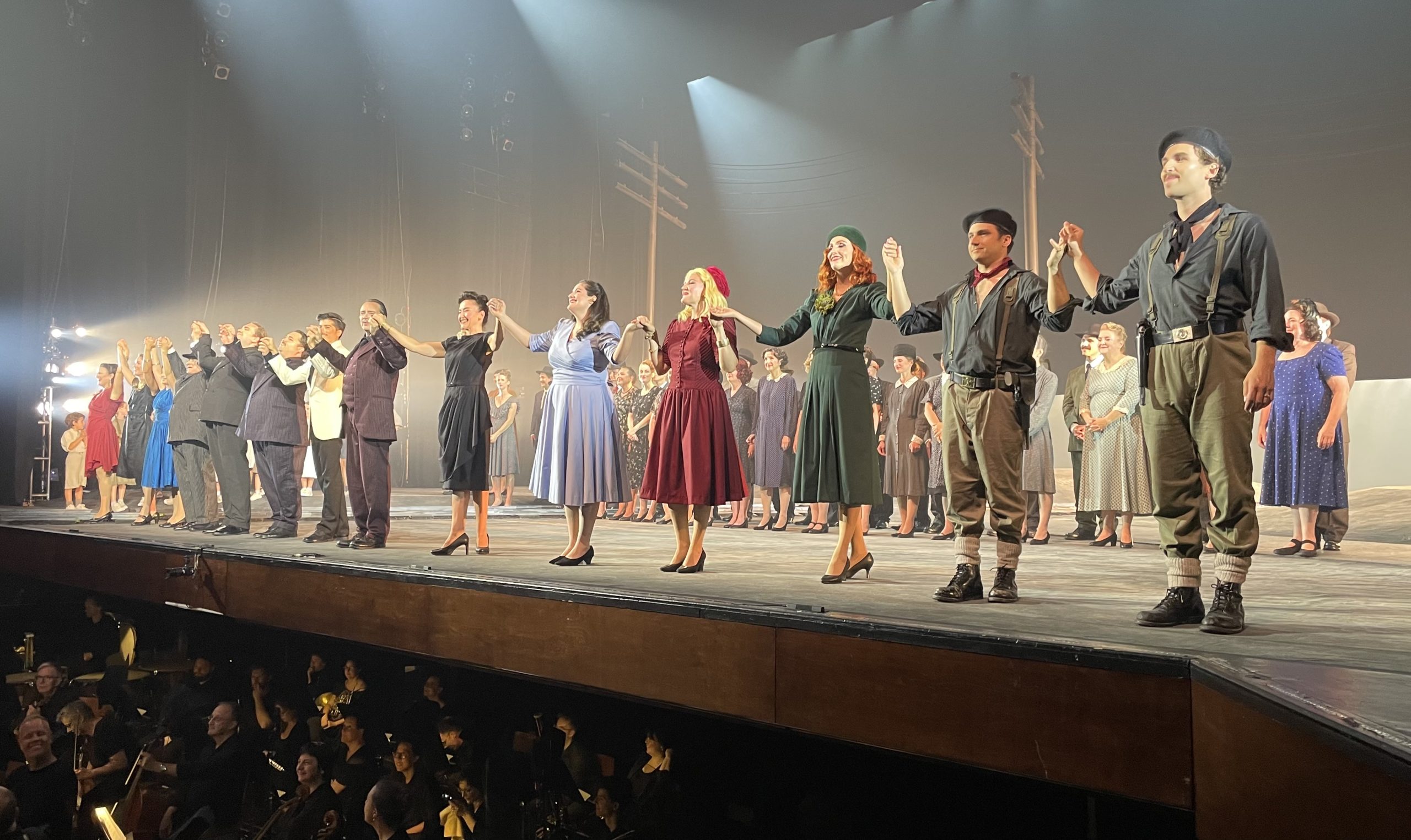 Members of the large cast of the Opéra de Québec Festival’s Carmen fill the stage at the Grand Théâtre on July 30. Stéphanie d’Oustrac, who portrayed Carmen, is in the centre of the stage, wearing a black dress. Members of the Orchestre symphonique de Québec can be seen in the pit below the front of the stage. (Photo by Shirley Nadeau)