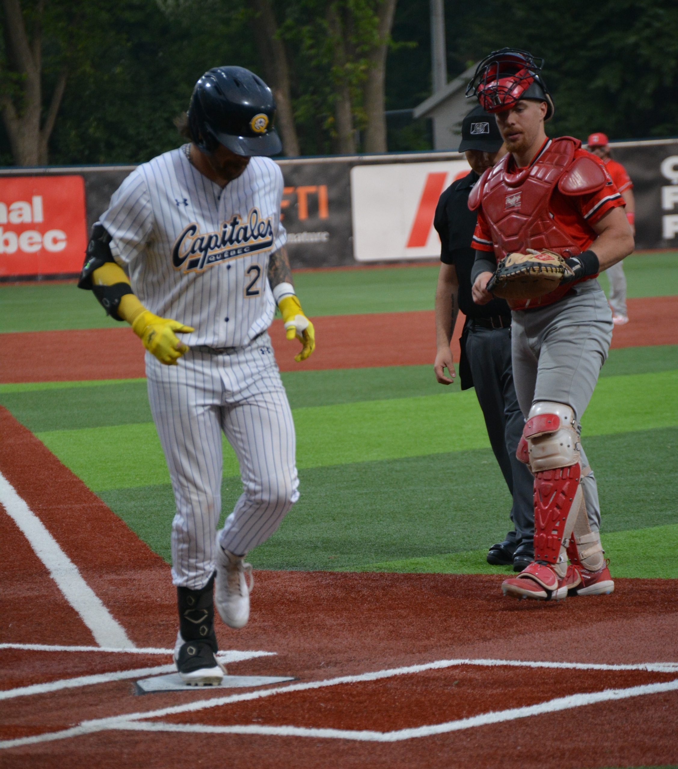 Jarrod Belbin of the Capitales crosses home plate after hitting a solo home run to tie the game 2-2 against the Ottawa Titans on July 30 at Stade Canac.The Titans later scored five unanswered runs and beat the Capitales 7-3 before a sellout crowd of 4,297 fans. (Photo by Luc Lang)
