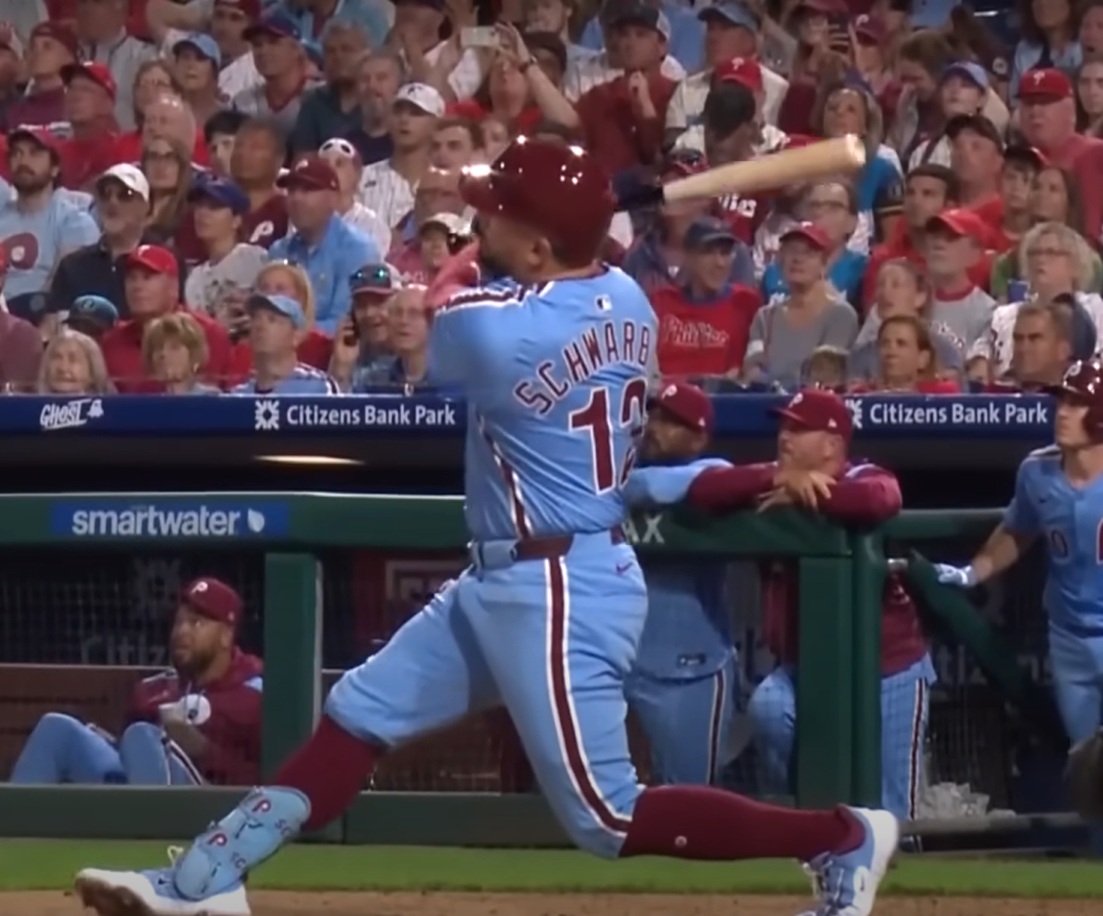 Kyle Schwarber of the Philadelphia Phillies became the 21st player in Major League Baseball history to hit four home runs in one game on Aug. 28, when he and the Phillies thrashed the Atlanta Braves 19-4. He is the third player to achieve this feat in 2025, after the Athletics’ Nick Kurtz and Arizona’s Eugenio Suarez. Before this season, the last player to hit four home runs in one game was J.D. Martinez in 2017. Schwarber also became the fourth Phillie to do so, the last being Hall-of-Famer Mike Schmidt in 1976, against the Chicago Cubs. (Screenshot) EYE ON SPORTS: Kyle Schwarber hits four home runs in one game