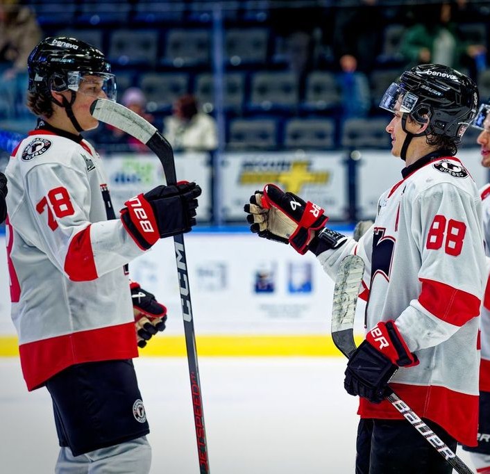 Cal Uens (88) congratulates teammate Louis-Thomas Lapointe after the Remparts defeated the Rimouski Océanic 10-6, on Jan. 10. Uens was named the team’s student-athlete of the month for December. (Photo courtesy of the QMJHL/Maxime Amyot) Cal Uens is the Remparts student- athlete of the month for December