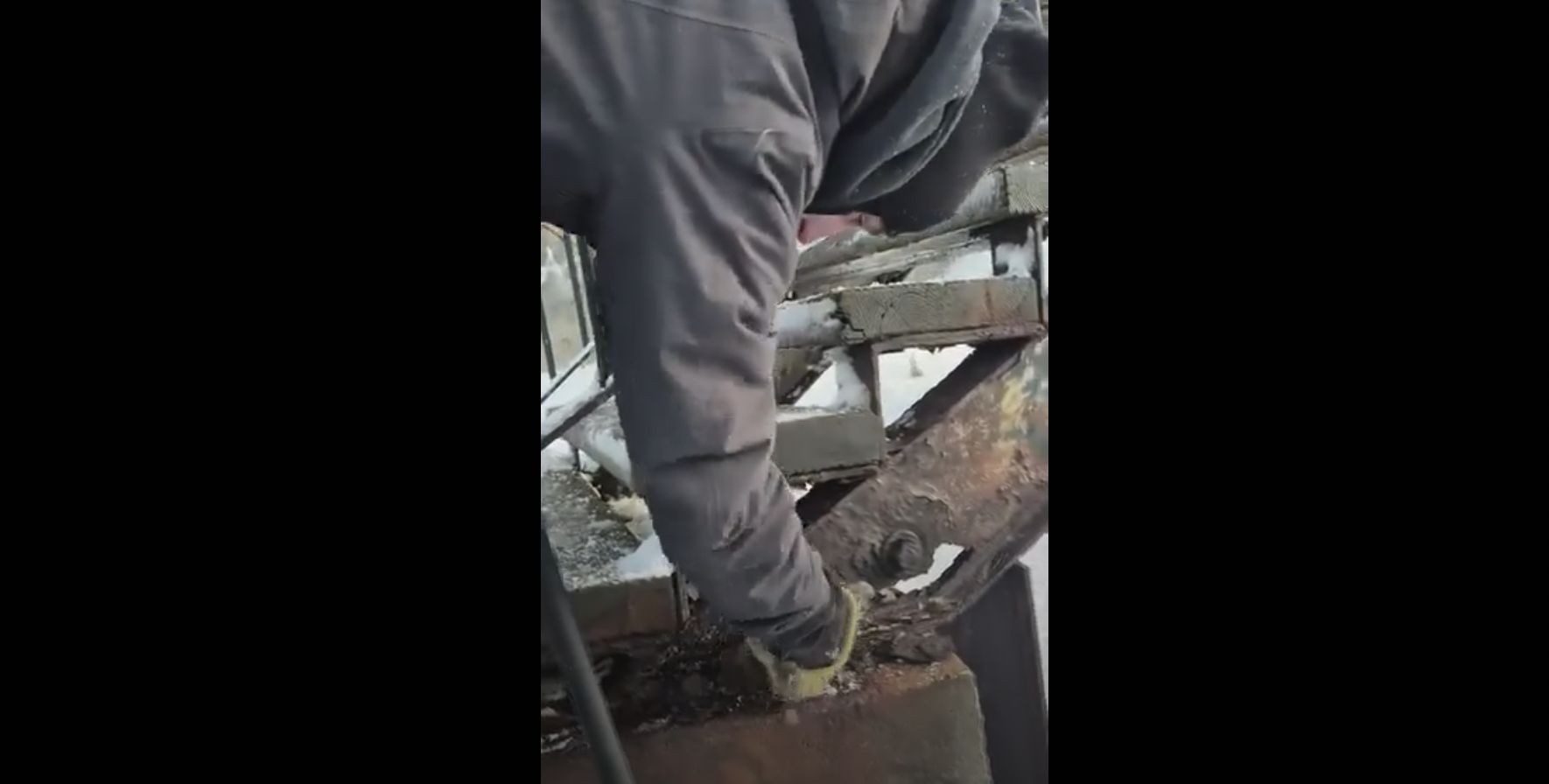 Maxime Drolet points out a hole in the metal structure holding up the Escalier du Faubourg, likely caused or exacerbated by salt water runoff corroding the metal. (Screenshot from Facebook Live) Escalier du Faubourg safe to use despite wear and tear, rust, city says
