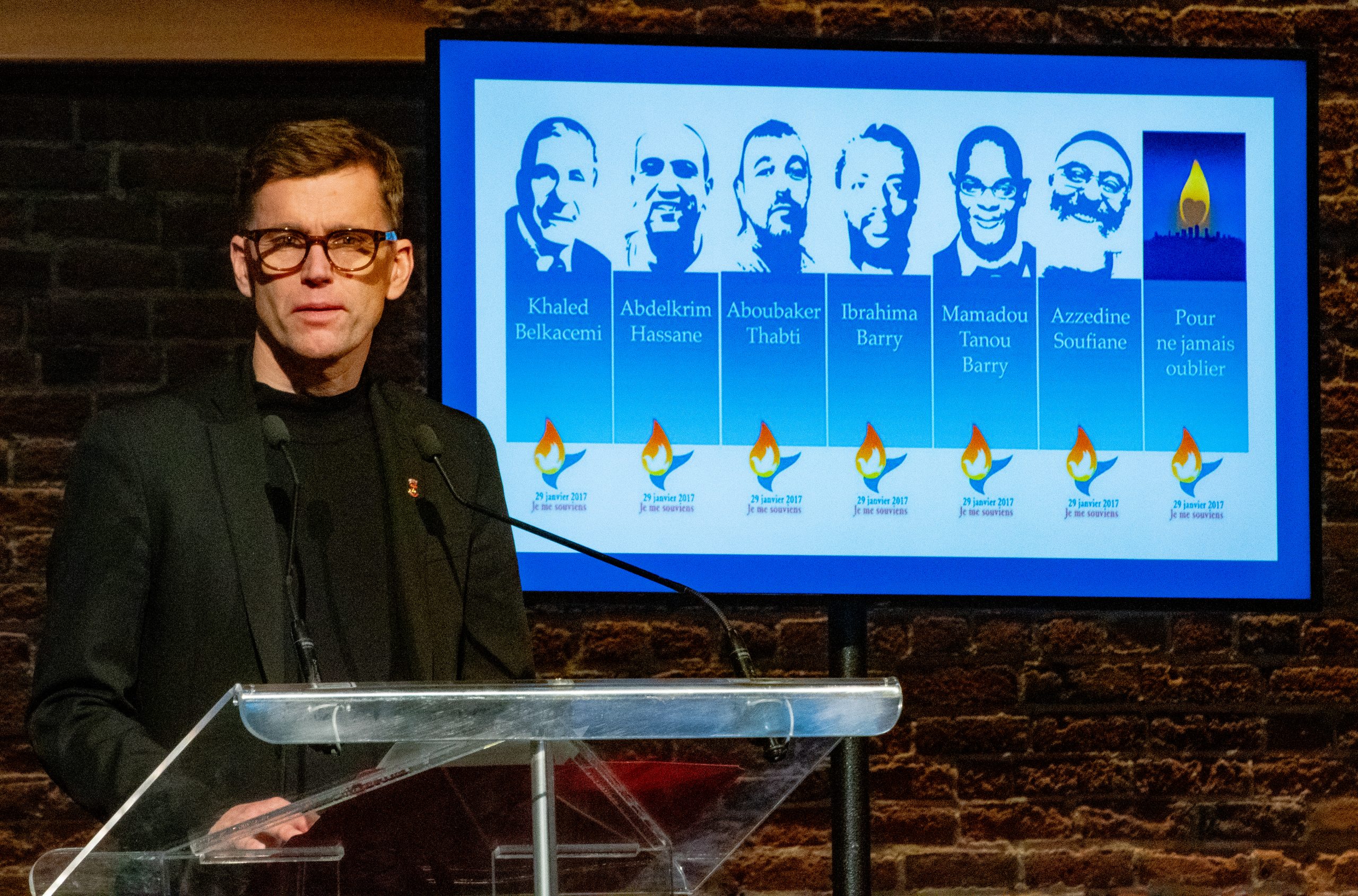 Mayor Bruno Marchand speaks at an event honouring victims and survivors of the Centre culturel islamique de Québec mass shooting, at the Manège Militaire on Jan. 29, 2025. (Photo by Cassandra Kerwin) City to organize commemorations for anniversary of mosque shooting