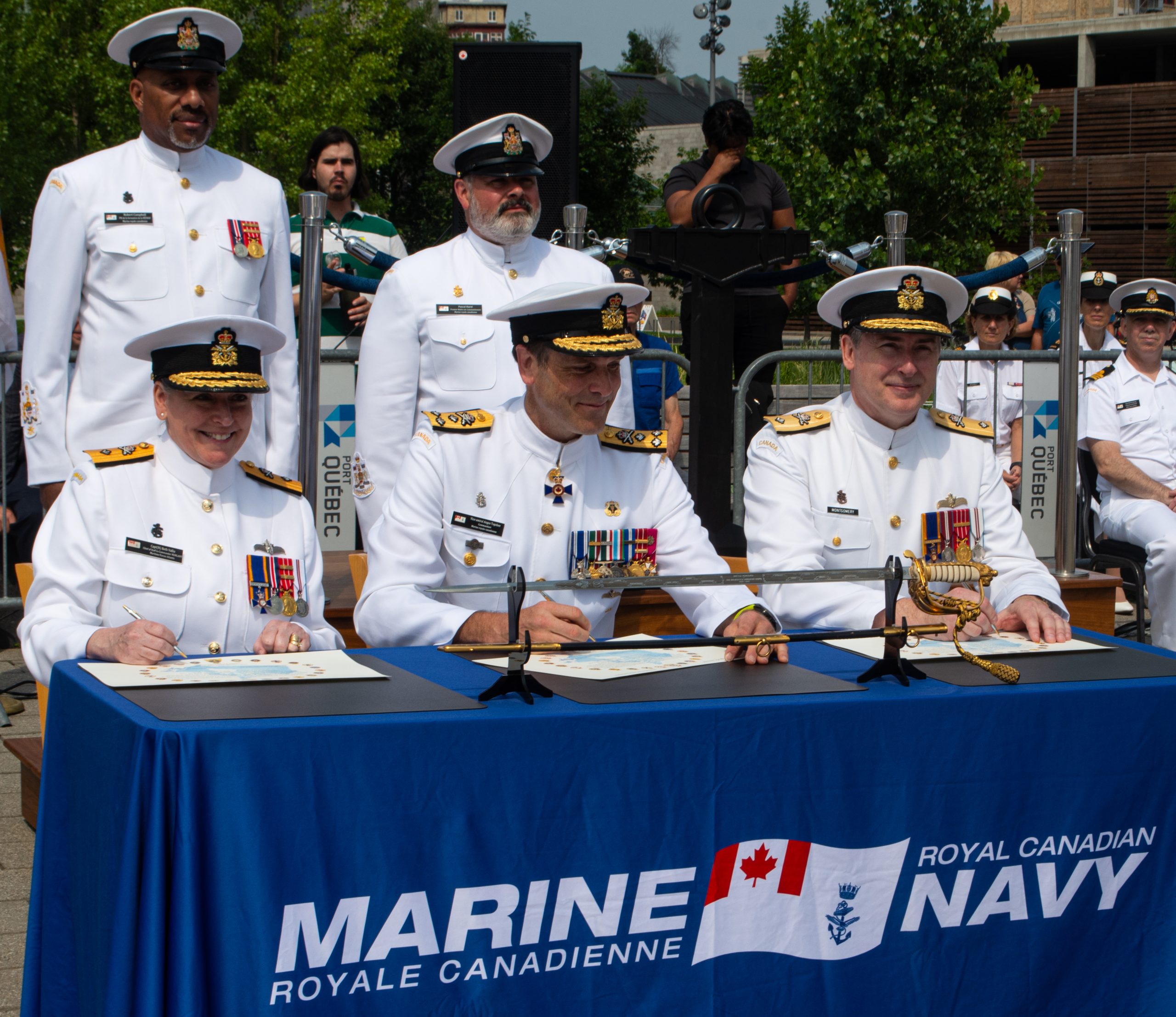 Commodore Beth Vallis, newly appointed commandant of the Naval Reserve; Vice-Admiral Angus Topshee, head of the Royal Canadian Navy, and Commodore Patrick Montgomery sign the official documents confirming the change of command of the Naval Reserve. (Photo by Cassandra Kerwin)
