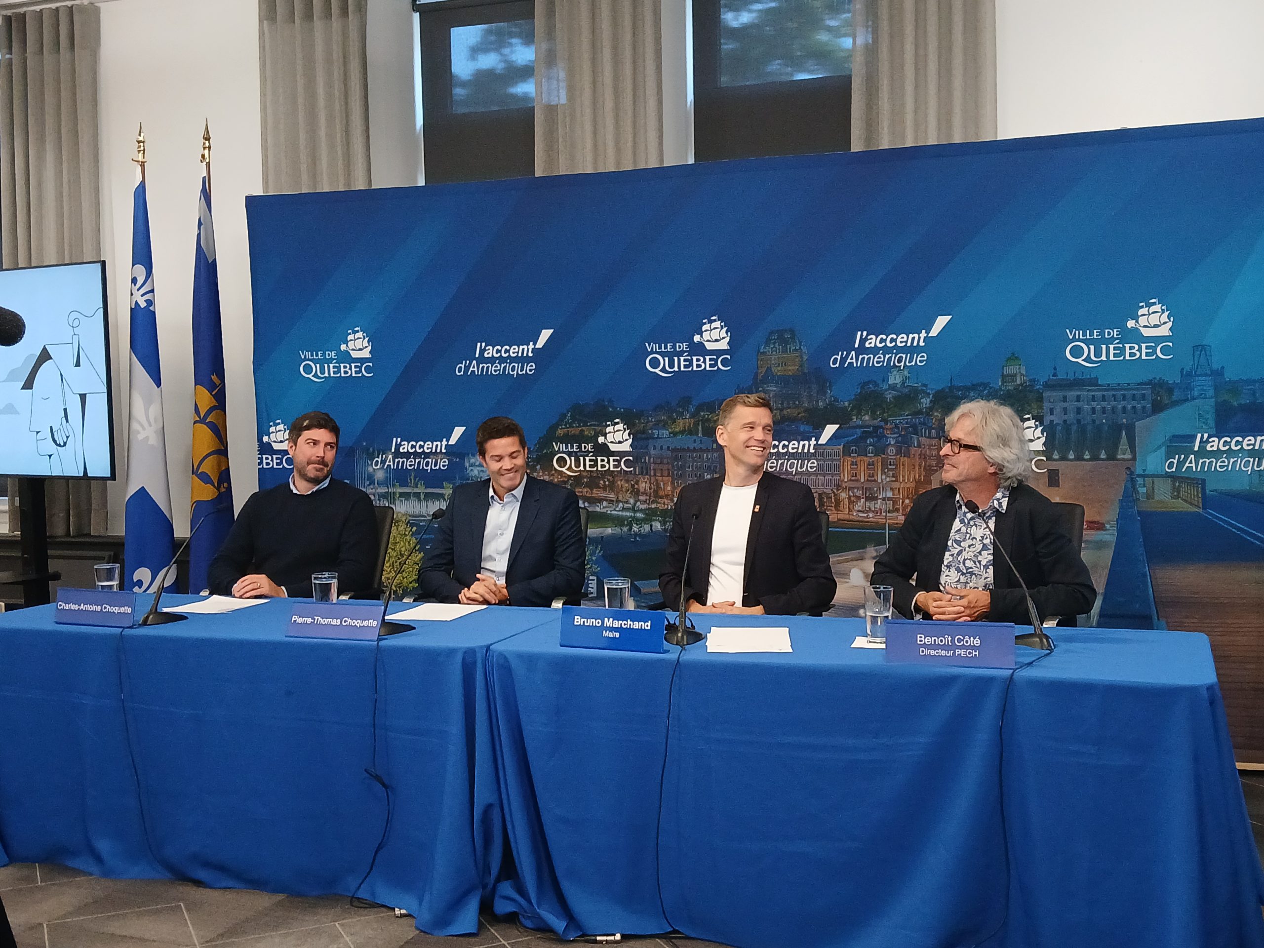 Mayor Bruno Marchand speaks at a City Hall press conference alongside philanthropists Charles-Antoine and Pierre-Thomas Choquette and Benoit Côté of PECH on Sept. 17. (Photo by Ruby Pratka)