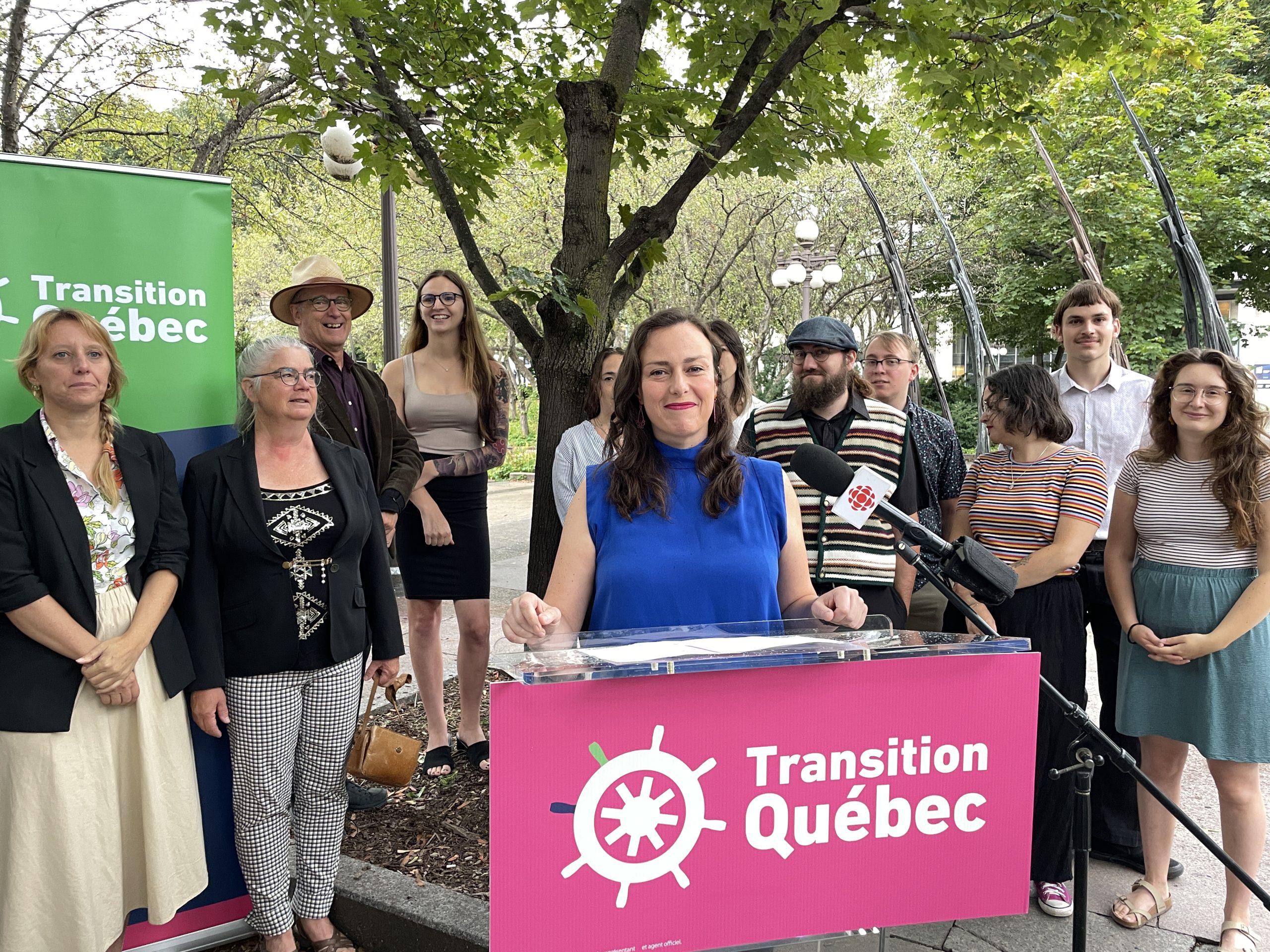 Transition Québec Leader and Limoilou Coun. Jackie Smith is surrounded by fellow TQ candidates at a campaign event in Jardin Jean-Paul-L’Allier on Aug. 25. (Photo by Céline Fiuza courtesy of Transition Québec)