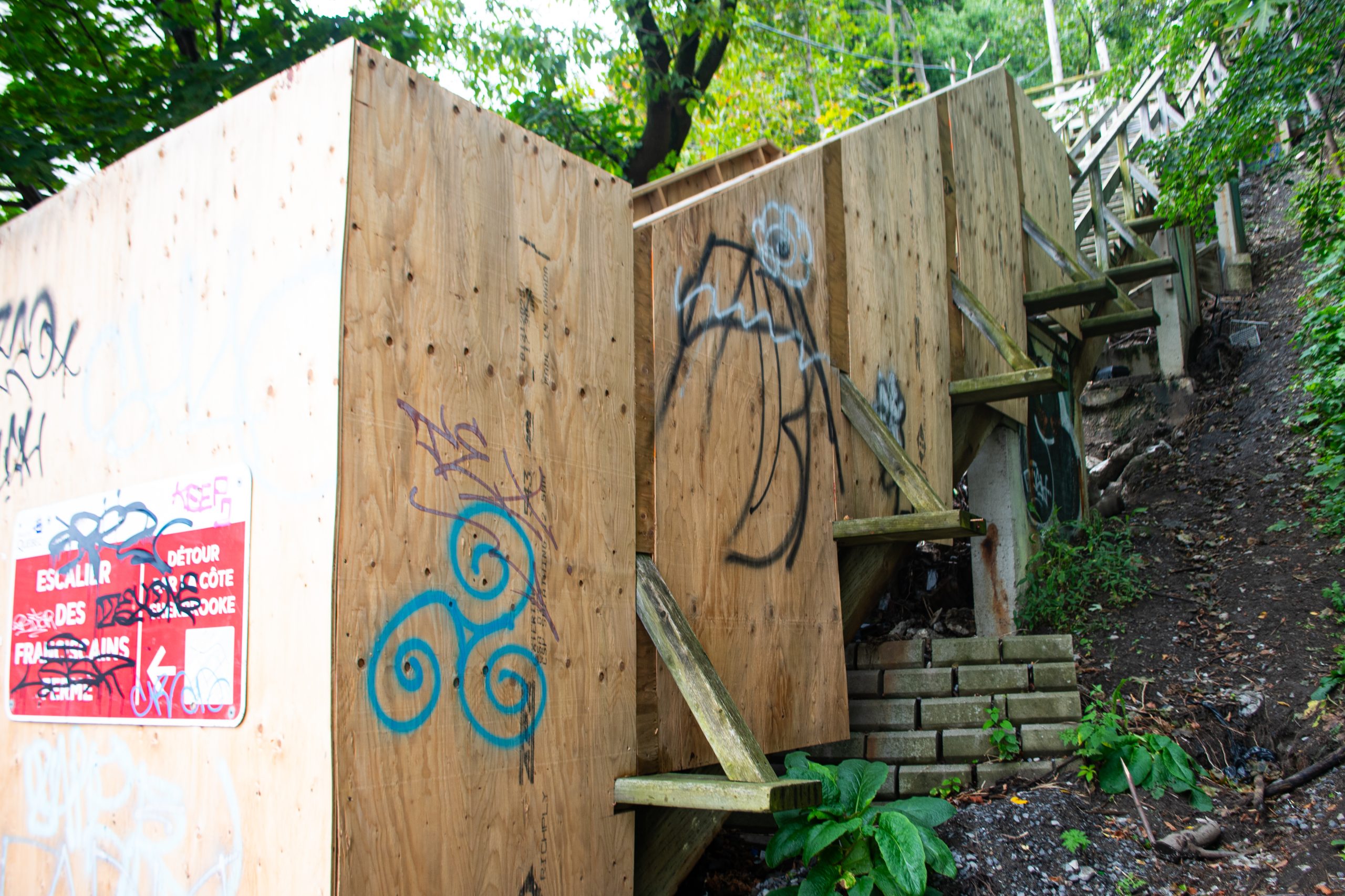 City crews blocked off the Escalier des Franciscains for safety reasons following the June 23 storm. This is the wall pedestrians now face when they come from Ave. de l’Alverne in Montcalm. (Photo by Cassandra Kerwin)