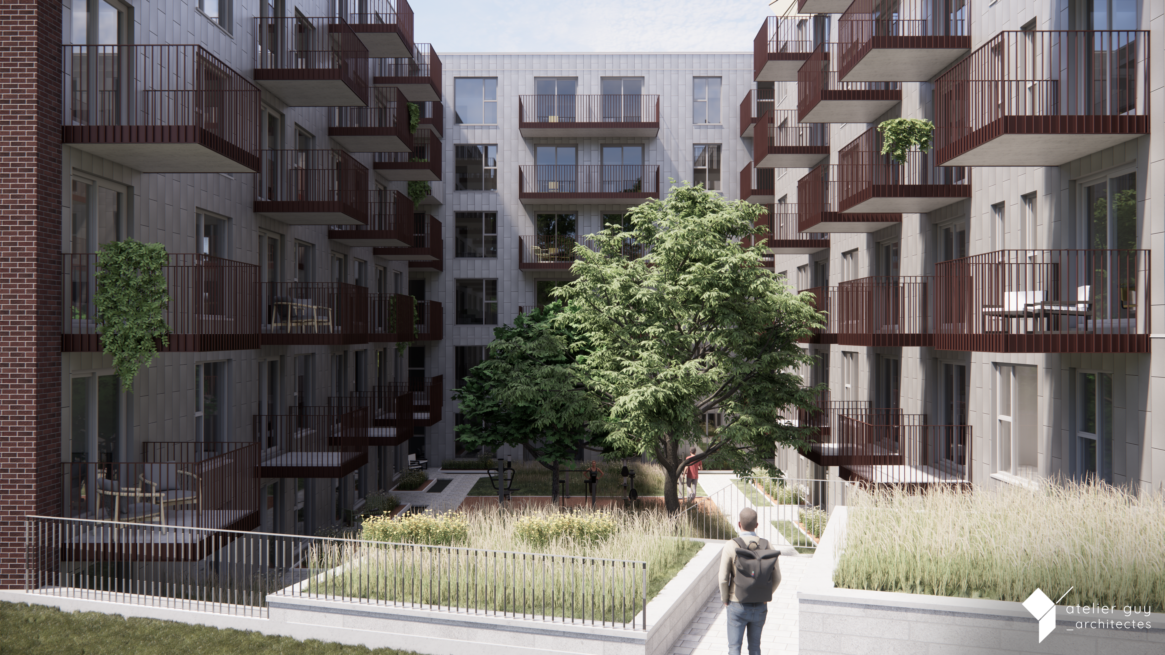 This architect’s image shows the courtyard between apartments in the Le Arno project to be built on a parking lot in Saint-Roch. (Image courtesy of Logis-Experts)