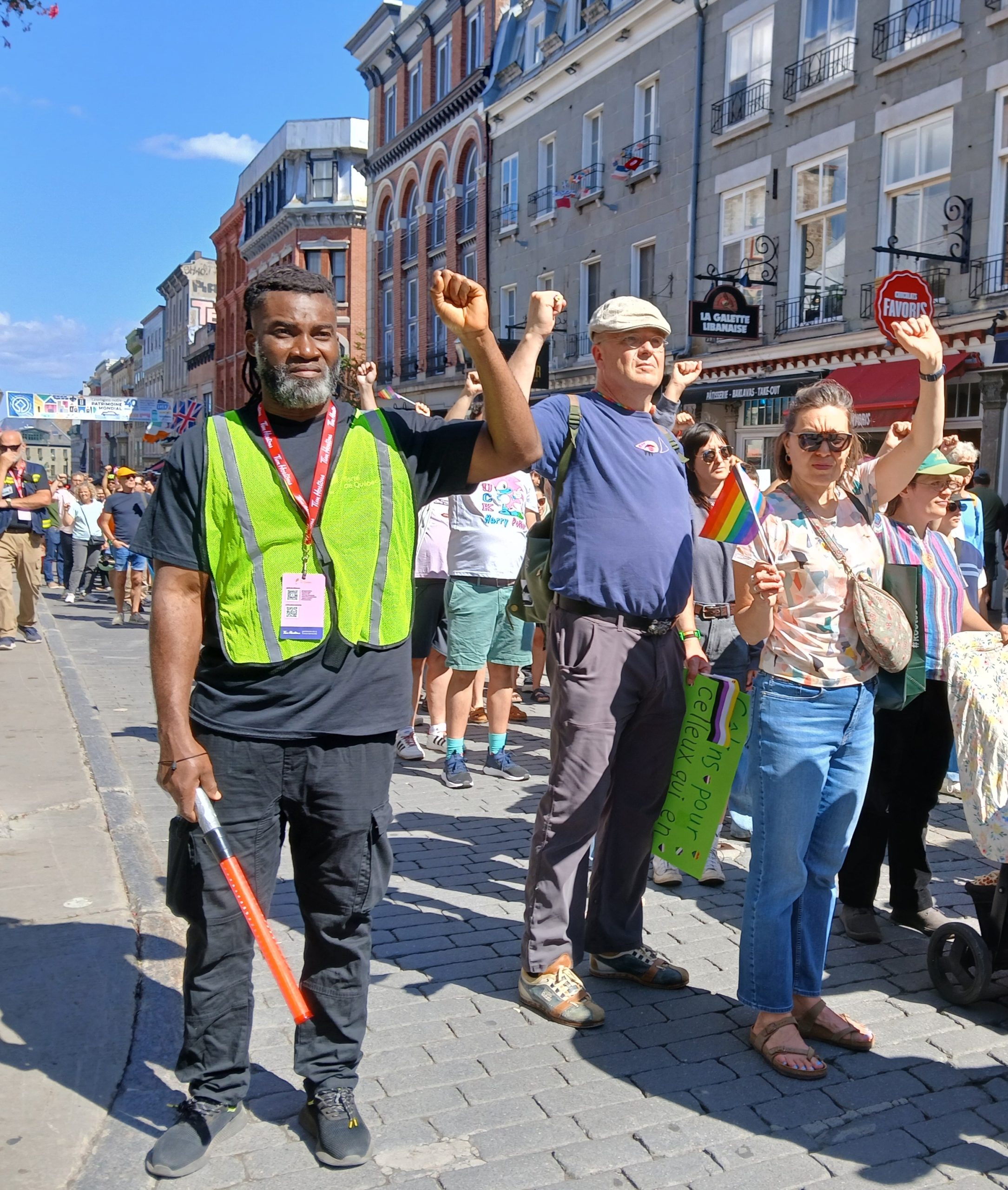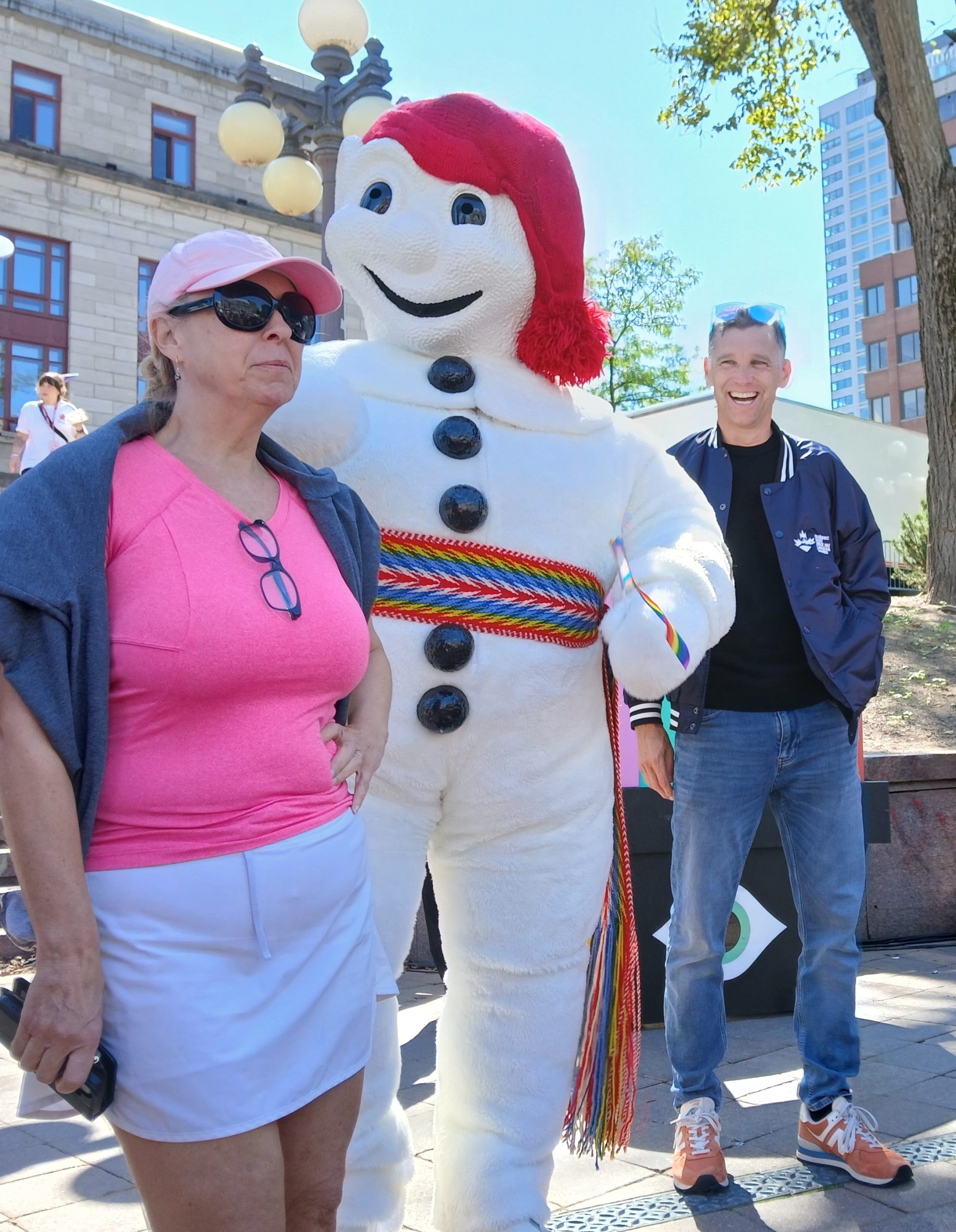 Place D’Youville filled with a sea of people early Sunday afternoon as the clock ticked down to the scheduled start time of the annual Pride march. Older gay couples walked hand in hand; teenagers in colourful outfits draped themselves in various iterations of the rainbow flag and other Pride flags, including at least one extraordinary hand-crocheted rainbow cape. Mayor Bruno Marchand and fellow mayoral candidates Jackie Smith and Claude Villeneuve walked with their families or party colleagues, and Bonhomme Carnaval put on his rainbow sash and posed for selfies with parade-goers despite the heat. Families marched with young children, and groups of friends embraced the “you be you” atmosphere and marched in butterfly, wolf or cat outfits. Members of the Sisters of Perpetual Indulgence – a Montreal- based performance art and community service group – marched in full makeup and glittering nuns’ habits.