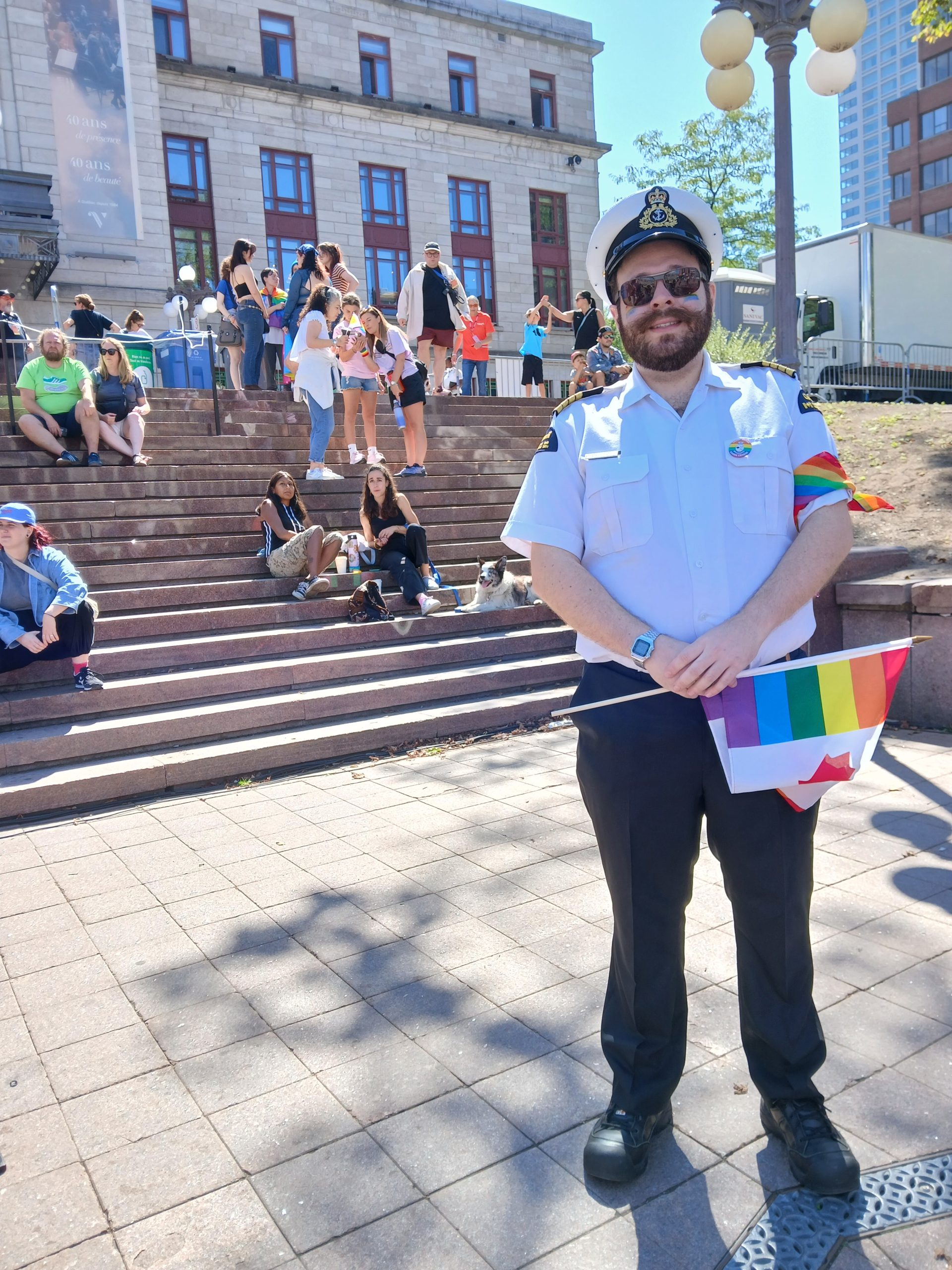 Amid the swirling colours, one person wore a captain’s uniform. “I’m marching for myself and for all the people who think [being gay, queer or trans] can be an obstacle to their career,” said Coast Guard Capt. Jean-Christophe Laroche, an icebreaker captain. “I’ve marched every year for the past few years, unless I’ve been on my boat, but I haven’t been in uniform. This year I asked my supervisor if I could march in uniform, and my supervisor was OK with it, so here I am. We are the ones responsible for maritime search and rescue, and we don’t want anyone to be scared to call us because of who they are. You will be treated with respect.”